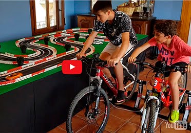 Disponemos del alquiler de circuito scalextric propulsado por bicicletas, de formal que al pedalear los participantes en los puestos con bicicletas (adultos y niños), harán que sus coches corran más o menos.